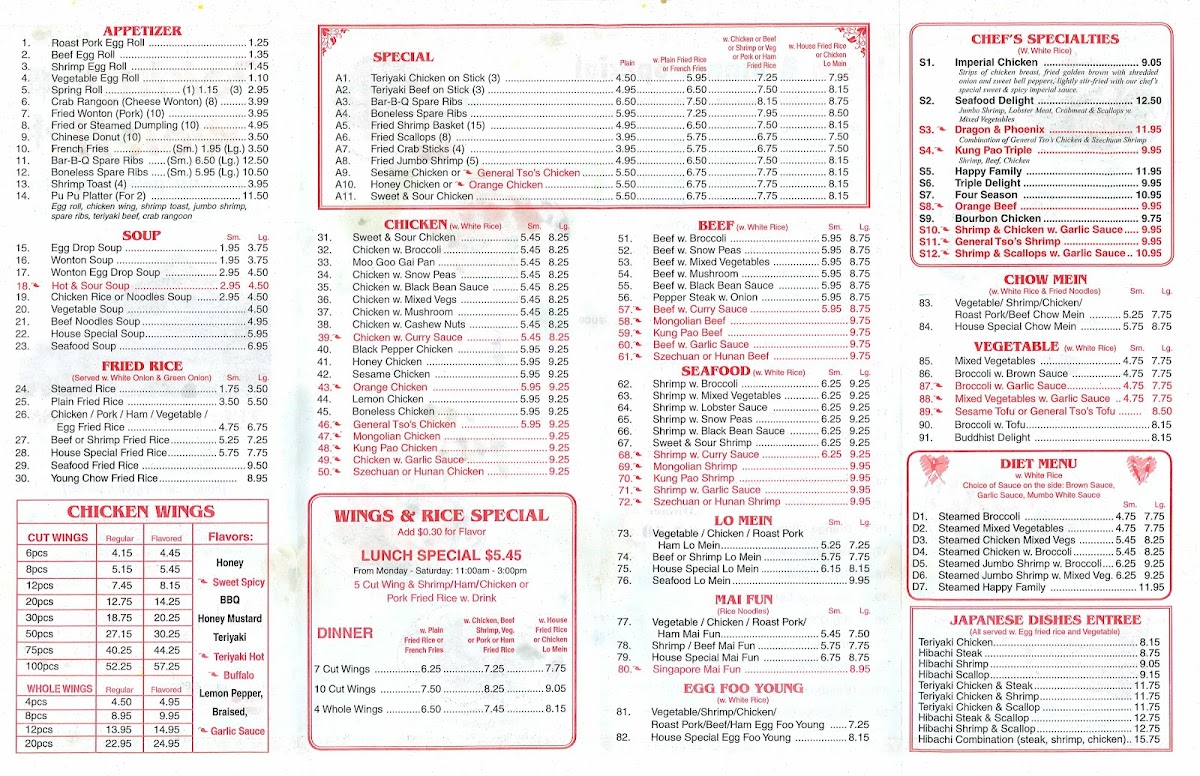 This is the kind of place where hearty portions and familiar tastes come together, ideal for a quick lunch, a relaxed dinner with friends or family, or an easy pick-up after a busy day. Whether you’re stopping in to enjoy a warm bowl of hot and sour soup or settling in for steamed or fried dumplings alongside savory mains like chicken with broccoli or boneless spare ribs, the menu supports a comfortable, unpretentious dining atmosphere.